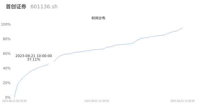 601136首创证券2023年08月21日成交103.39万手,成交金额28.55亿元,相较昨日缩量2.38万手,换手率37.83%,成交活跃。
