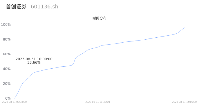 601136首创证券2023年08月31日成交65.42万手,成交金额16.13亿元,相较昨日缩量10.27万手,换手率23.94%,成交活跃。