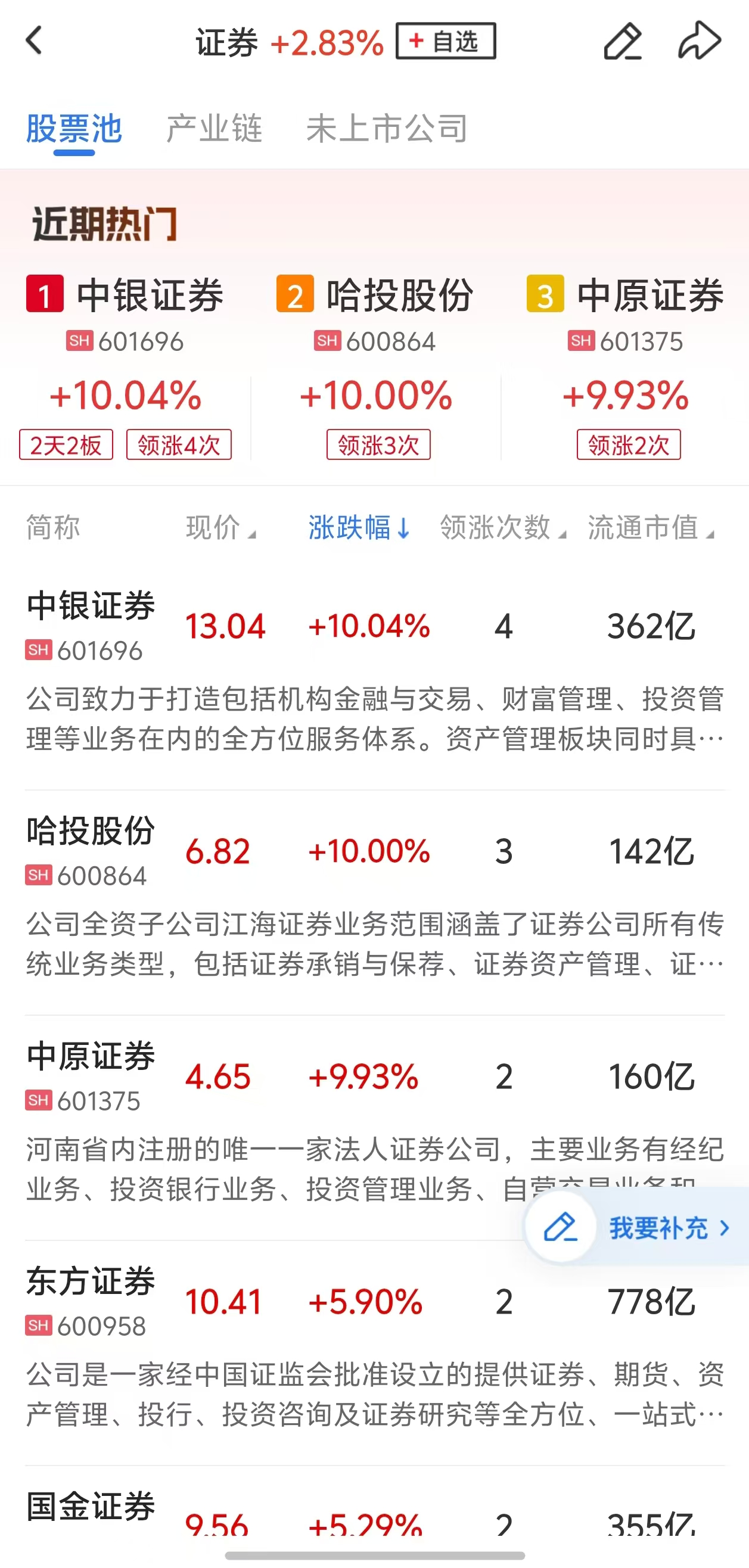 个股层面呈现普涨格局,49只券商股全部收红,其中29只个股涨幅超2%。中银证券、哈投股份、中原证券3股强势涨停,中银证券更是实现“二连板”,领涨板块。