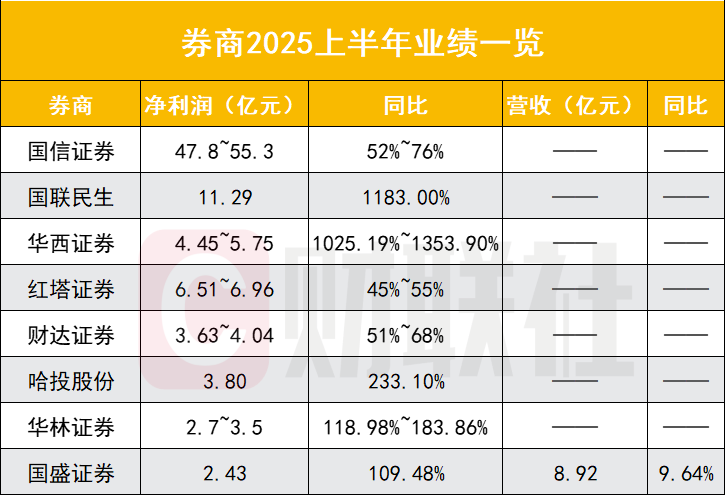 承接一季度的业绩向好,券商板块2025年上半年业绩预增潮涌现。截至7月11日,已有7家券商股发布上半年业绩预喜公告,净利润同比增幅均超45%,国联证券、华西证券预增幅度更是突破10倍。昨晚也一度出现了行业人士喜大普奔发朋友圈庆贺的景象。