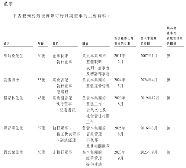 张涛博士,53岁,为公司党委书记、执行董事、总经理。张博士于2024年4月加入公司担任总经理,于2024年5月获委任为董事,并于2025年8月28日调任执行董事。他主要负责集团的整体经营管理。