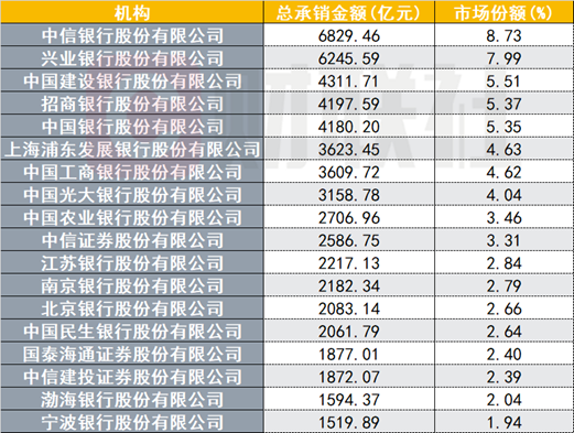 其中,中信证券、中信银行、兴业银行位居前三。除头部机构外,浙商银行、江苏银行、南京银行以及首创证券等民企债承销额较多。
