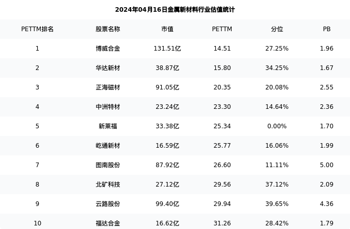 从估值角度看:博威合金最新市盈率PETTM为14.51,在行业内排名1/27,处于27.25分位。