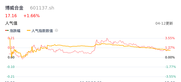 04月12日,博威合金收报17.16,股价涨幅1.66%,成交金额4.64亿元,换手率3.46%。