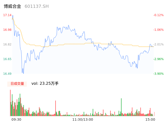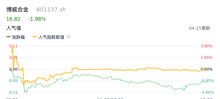 04月15日,博威合金收报16.82,股价涨幅-1.98%,成交金额3.90亿元,换手率2.98%。