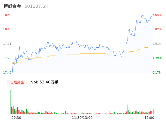 04月25日,博威合金收报18.31,股价涨幅4.87%,成交金额9.55亿元,换手率6.85%。