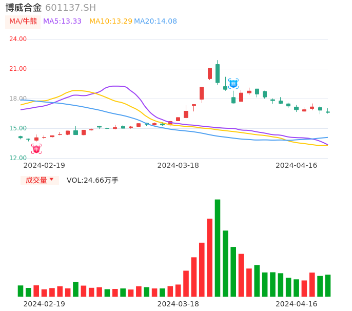 04月16日,博威合金收报16.60,股价涨幅-1.31%,成交金额4.13亿元,换手率3.16%。