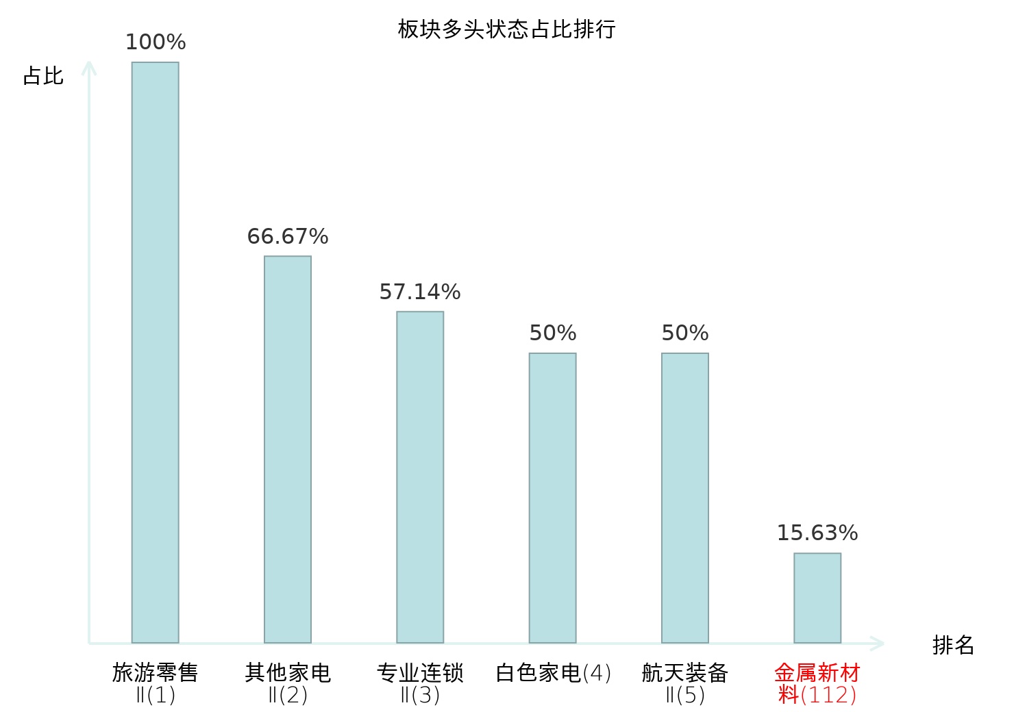 全市场所有行业板块中主力多头状态占比排名中,旅游零售Ⅱ板块位居第一。股份制银行Ⅱ板块名次提升最快,较昨日上升79位。