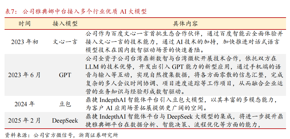 公司积极融合AI、大数据等智能技术,持续推进鼎捷雅典娜平台的研发升级,拓展数智驱动的AI新应用,基于深厚的行业knowhow持续推动AI在TOB领域的场景落地,赋能千行百业数智化转型。公司以“智能+”战略为引领,多领域布局,构建了强大的鼎捷领域大模型,还整合了如DeepSeek、GPT全系列模型、通义千问、豆包、文心一言等先进大模型,积极拓展AI应用场景。