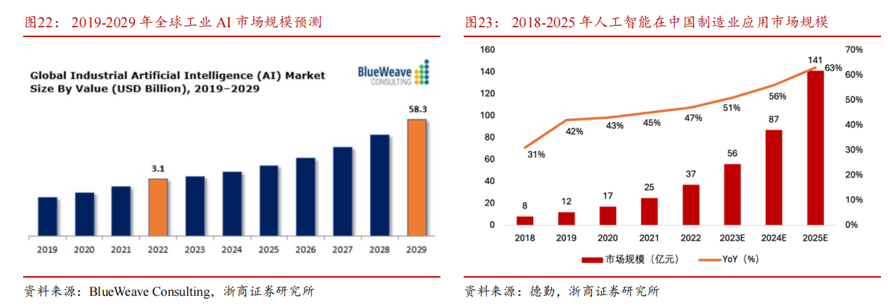BlueWeaveConsulting数据显示,2022年全球工业AI市场规模约为31亿美元,预计到2029年这一市场规模将达到583亿美元,2022-2029年复合增长率约为52.07%。我国AI+工业应用有望加速渗透,2025市场规模超140亿元。根据德勤数据预测,至2025年我国人工智能在制造业应用的市场规模有望达到141亿元,2018-2025年复合增长率达到50.67%。