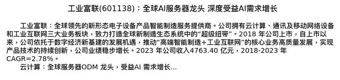 值得注意的是:2024年06月财通证券的张益敏分析师,首次发布关于工业富联的研究报告,标题为:工业富联(601138):全球AI服务器龙头 深度受益AI需求增长。