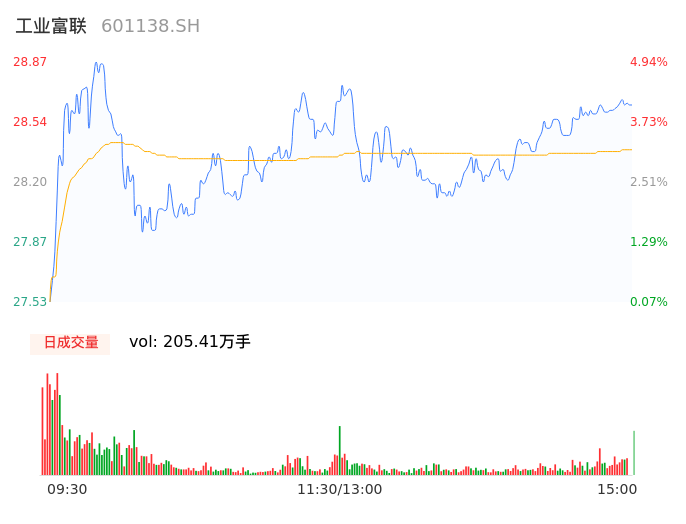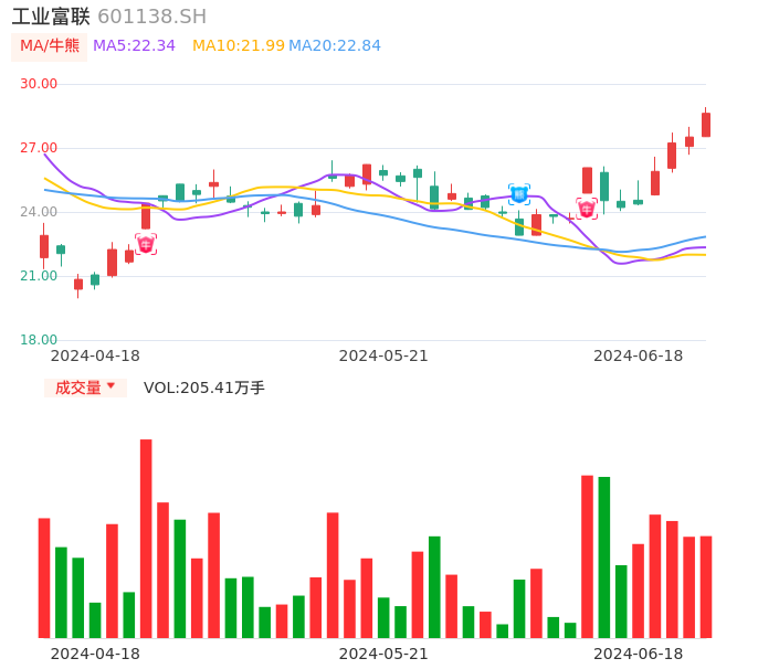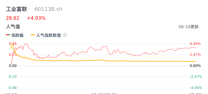 06月18日,工业富联收报28.62,股价涨幅4.03%,成交金额58.30亿,换手率1.04%。
