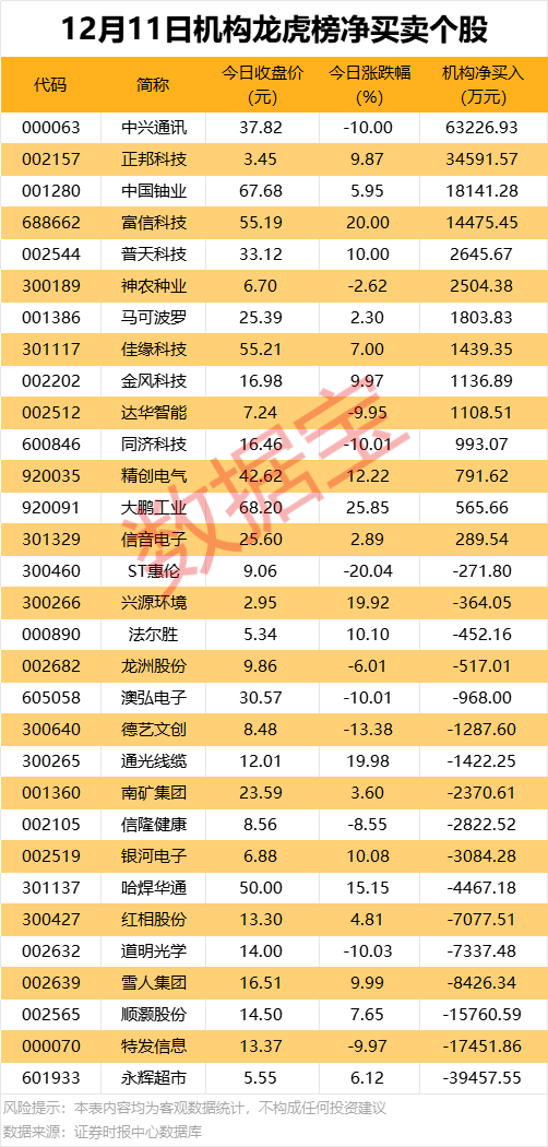 今日龙虎榜中,净买入个股有14只,净卖出的个股为17只。4股净买入金额均超1亿元,中兴通讯获机构净买入6.32亿元,居首;其次是正邦科技、中国铀业、富信科技,机构净买入金额分别为3.46亿元、1.81亿元、1.45亿元。