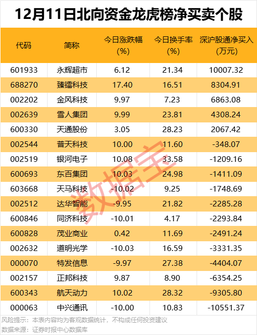 今日龙虎榜现身个股中,5股获北向资金净买入,其中永辉超市获北向资金净买入超1亿元,居首;臻镭科技、金风科技获北向资金净买入均超6000万元。