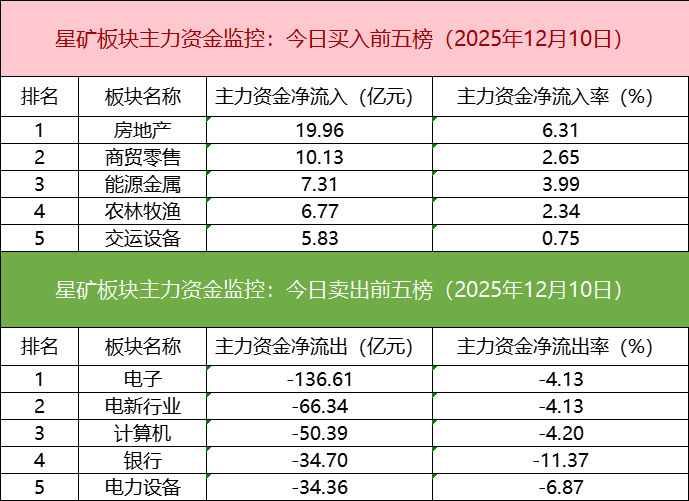 从主力板块资金监控数据来看,房地产板块主力资金净流入居首。