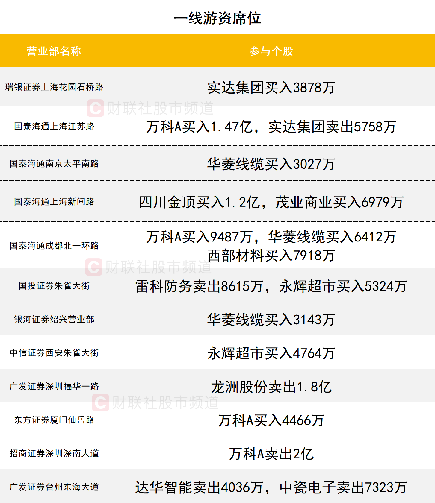 一线游资活跃度较高,地产板块今日快速拉升,万科A涨停,获三家一线游资席位(国泰海通证券上海江苏路、国泰海通证券成都北一环路、东方证券厦门仙岳路)分别买入1.47亿元、0.94亿元、0.44亿元,同时遭另一家游资席位(招商证券深圳深南大道)卖出2亿。