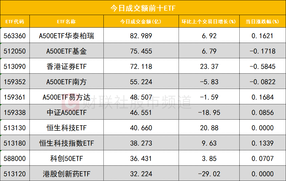 从成交额前十的ETF来看,A500ETF华泰柏瑞(563360)成交额位居首位,A500ETF基金(512050)成交额位居次席。