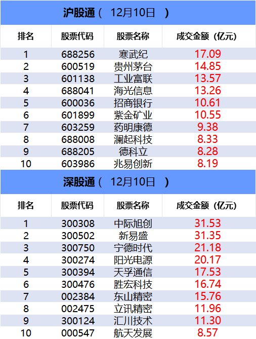 从沪股通前十大成交个股来看,寒武纪位居首位;贵州茅台和工业富联分居二、三位。