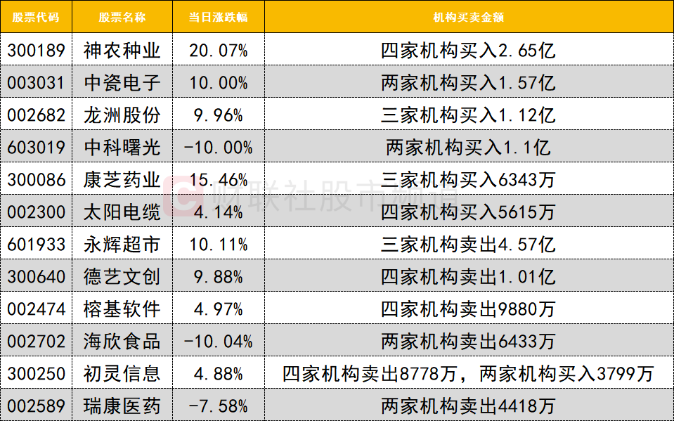 卖出方面,德艺文创今日炸板回落,遭四家机构卖出1.01亿。福建板块人气股海欣食品遭两家机构卖出6433万。零售人气股永辉超市一字涨停,遭三家机构大幅卖出4.57亿。