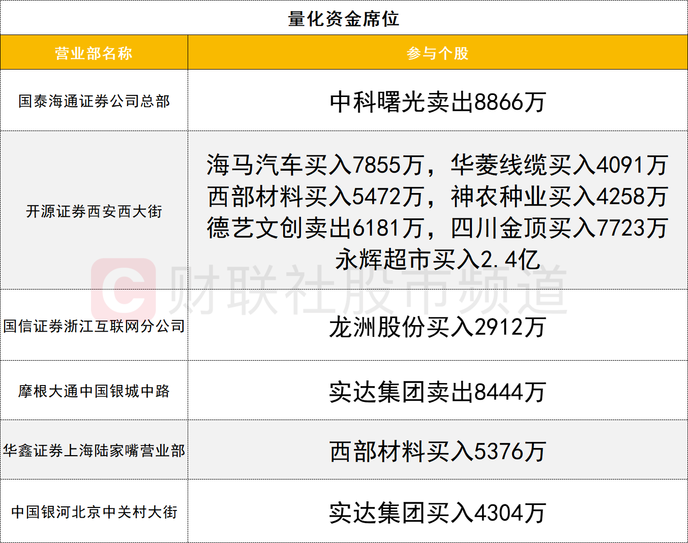 量化资金活跃度有所降低,神农种业获一家量化资金席位(开源证券西安西大街)买入4258万元。此外,该席位2.4亿元买入永辉超市。