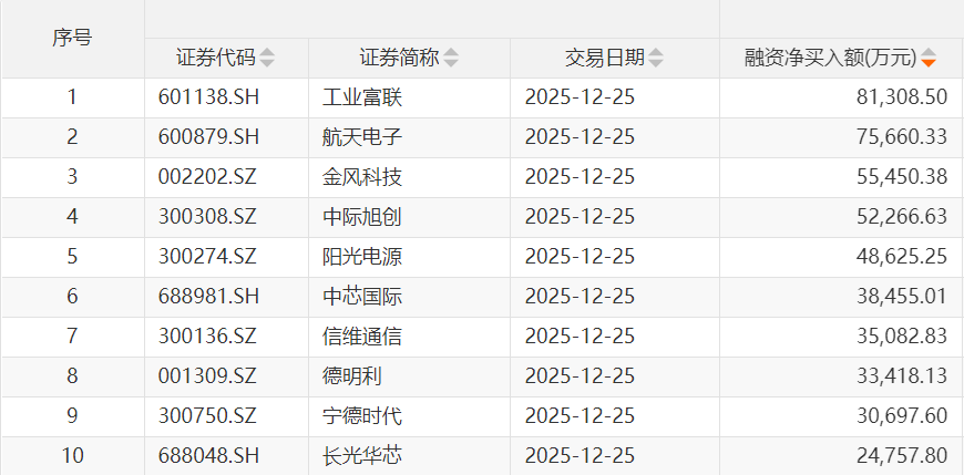 个股方面,51只股获融资净买入额超1亿元。工业富联获融资净买入额居首,净买入8.13亿元;融资净买入金额居前的还有航天电子、金风科技、中际旭创、阳光电源、中芯国际、信维通信、德明利、宁德时代、长光华芯等。