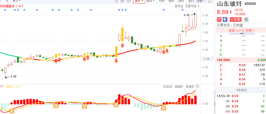 2)山东玻纤-四维操盘-近期出现火箭信号且底部量柱由绿转红