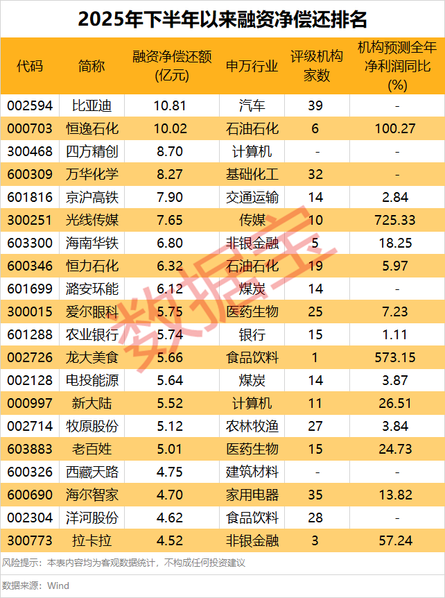 下半年以来,171股融资净偿还额超过1亿元。其中,比亚迪、恒逸石化逾10亿元,分别为10.81亿元、10.02亿元;四方精创、万华化学、京沪高铁、光线传媒、海南华铁、恒力石化、潞安环能等7股融资净偿还额均在6亿元以上。