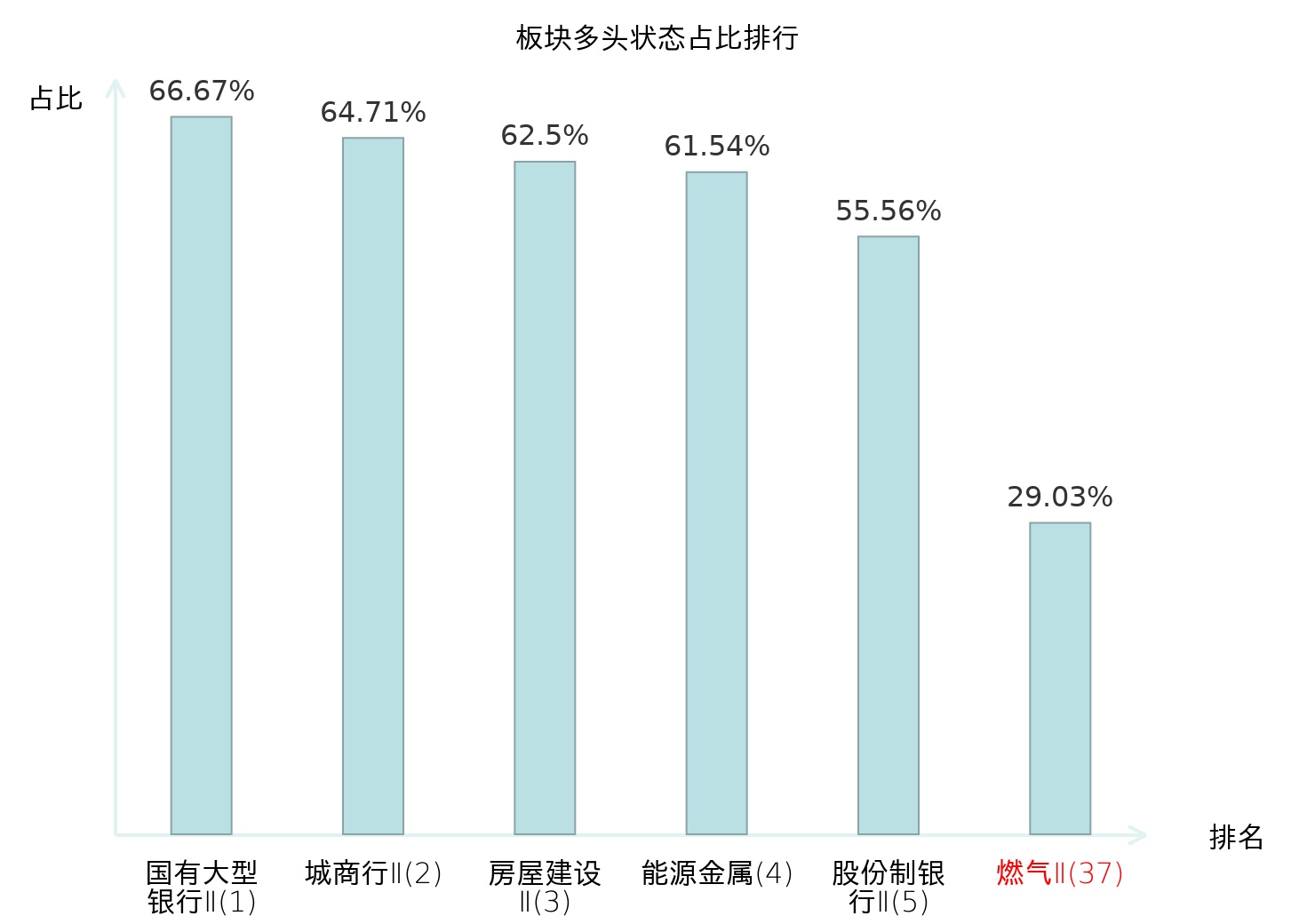 全市场所有行业板块中主力多头状态占比排名中,国有大型银行Ⅱ板块位居第一。普钢板块名次提升最快,较昨日上升65位。