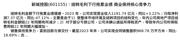 值得注意的是:2024年04月海通证券的涂力磊分析师,首次发布关于新城控股的研究报告,标题为:新城控股(601155):结转毛利下行拖累业绩 商业保持核心竞争力。