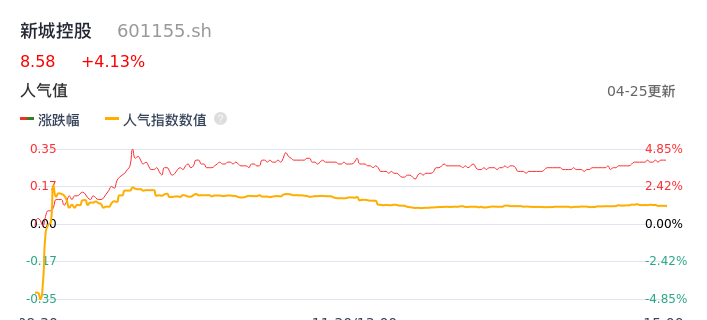 04月25日,新城控股收报8.58,股价涨幅4.13%,成交金额1.71亿元,换手率0.90%。