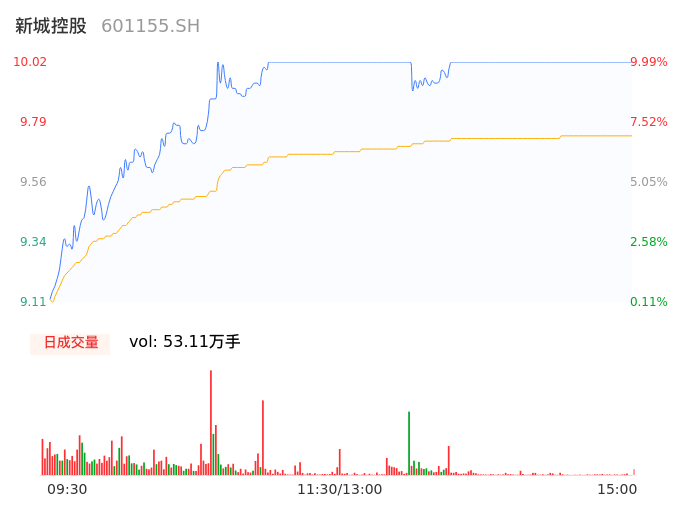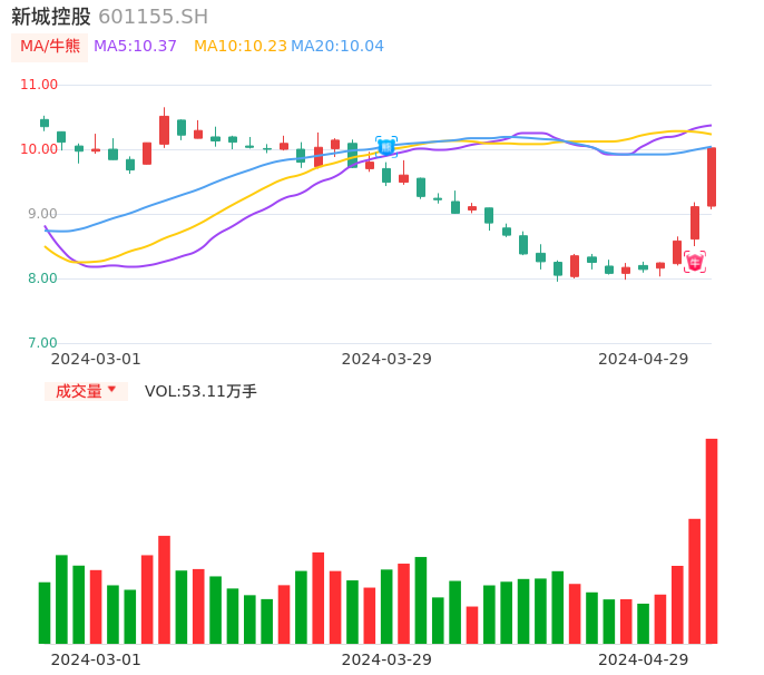 04月29日,新城控股收报10.02,股价涨幅9.99%,成交金额5.17亿元,换手率2.35%。