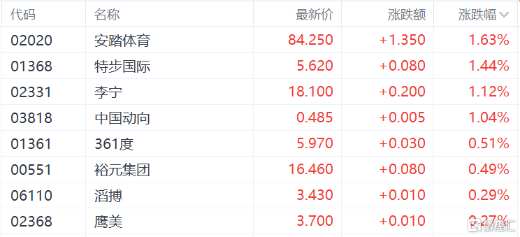 体育用品股齐涨,安踏体育、特步国际、李宁、中国动向涨超1%。