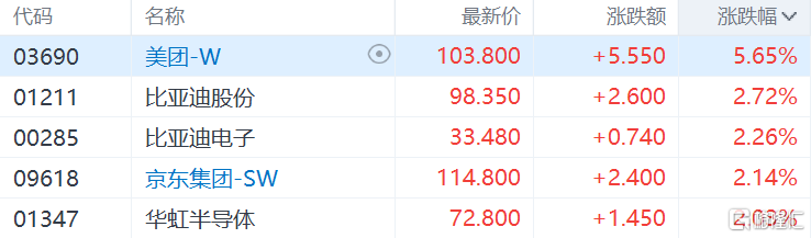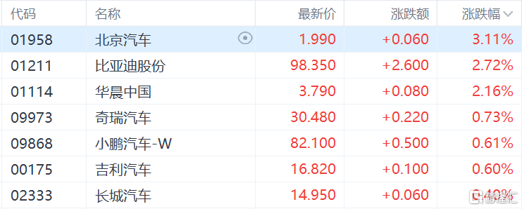 汽车股部分上涨,北京汽车涨超3%,比亚迪股份、华晨中国涨超2%,小鹏汽车-W、吉利汽车、长城汽车跟涨。