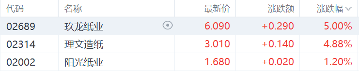 纸业股涨幅居前,玖龙纸业涨5%,理文造纸涨4.88%,晨鸣纸业涨1.2%。