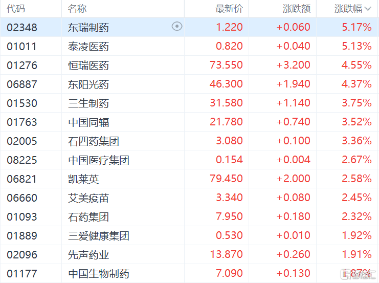 药品股纷纷上行,东瑞制药、泰凌医药涨超5%,恒瑞医药、东阳光药涨超4%,三生制药、凯莱英、石药集团、先声药业、中国生物制药跟涨。