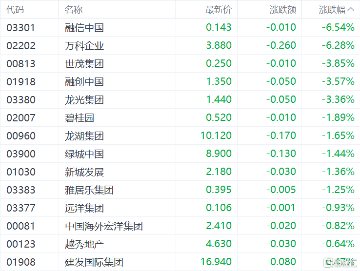 内房股下跌,融信中国、万科企业跌超6%,世茂集团、融创中国、龙光集团跌超3%,碧桂园、龙湖集团、绿城中国、雅居乐集团、远洋集团跟跌。