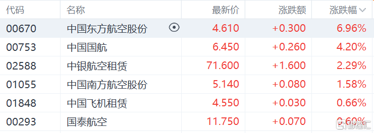 航空股部分飘红,东方航空涨近7%,中国国航涨4.2%,南方航空涨1.58%。