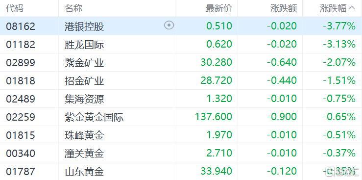 黄金及贵金属板块下跌,紫金矿业跌超2%,招金矿业跌超1%,集海资源、紫金黄金国际、潼关黄金、山东黄金纷纷下跌。