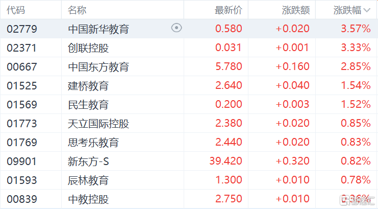 内地教育股多数上涨,中国新华教育、创联控股涨超3%,建桥教育、民生教育涨超1%,天立国际控股、思考乐教育、新东方-S、辰林教育跟涨。