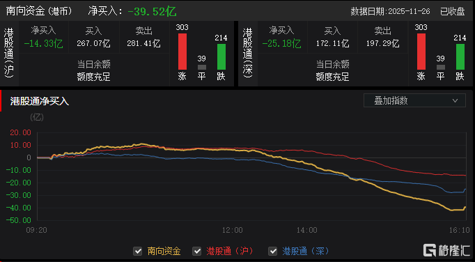 今日,南向资金净卖出39.52亿港元,其中港股通(沪)净卖出14.33亿港元,港股通(深)净卖出25.18亿港元。