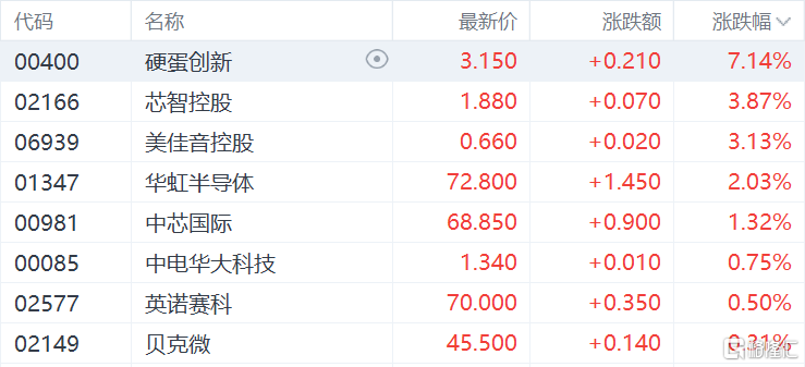 半导体板块上涨,芯智控股、美佳音控股涨超3%,华虹半导体涨超2%,中芯国际涨超1%。