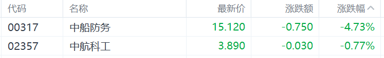 地缘政治有缓和迹象,军工股持续回调,中船防务跌4.73%,中航科工跌0.77%。