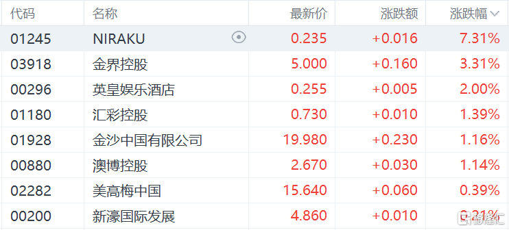 濠赌股表现活跃,金界控股涨超3%,汇彩控股、金沙中国、澳博控股涨超1%。