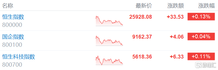 11月26日,港股高开震荡尾盘涨幅持续收窄,恒生指数涨0.13%,国企指数、恒生科技指数分别上涨0.04%及0.11%,大市总体呈现3连涨行情。