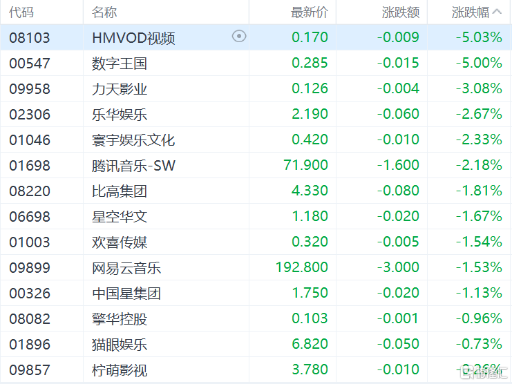 影视娱乐股表现低迷,乐华娱乐、腾讯音乐-SW跌超3%,星空华文、欢喜传媒、网易云音乐跌超1%。