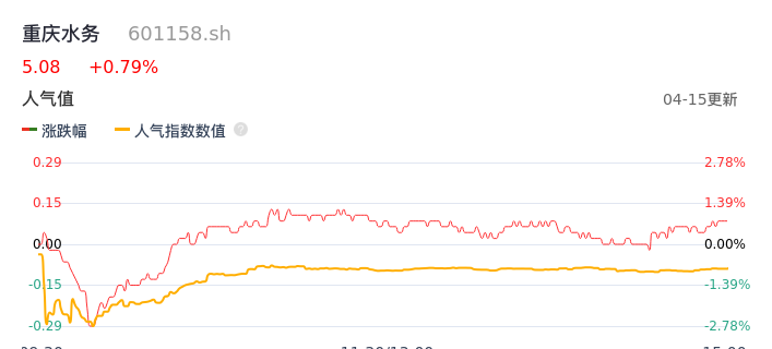 04月15日,重庆水务收报5.08,股价涨幅0.79%,成交金额1.36亿元,换手率0.56%。