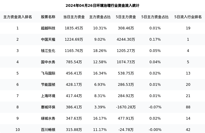 从主力资金流向来看,环境治理行业今日主力资金流入13.32亿元,在所有申万二级行业中排名:86/131。