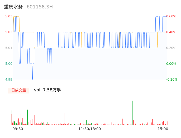 04月24日,重庆水务收报5.03,股价涨幅0.60%,成交金额3800.85万元,换手率0.16%。