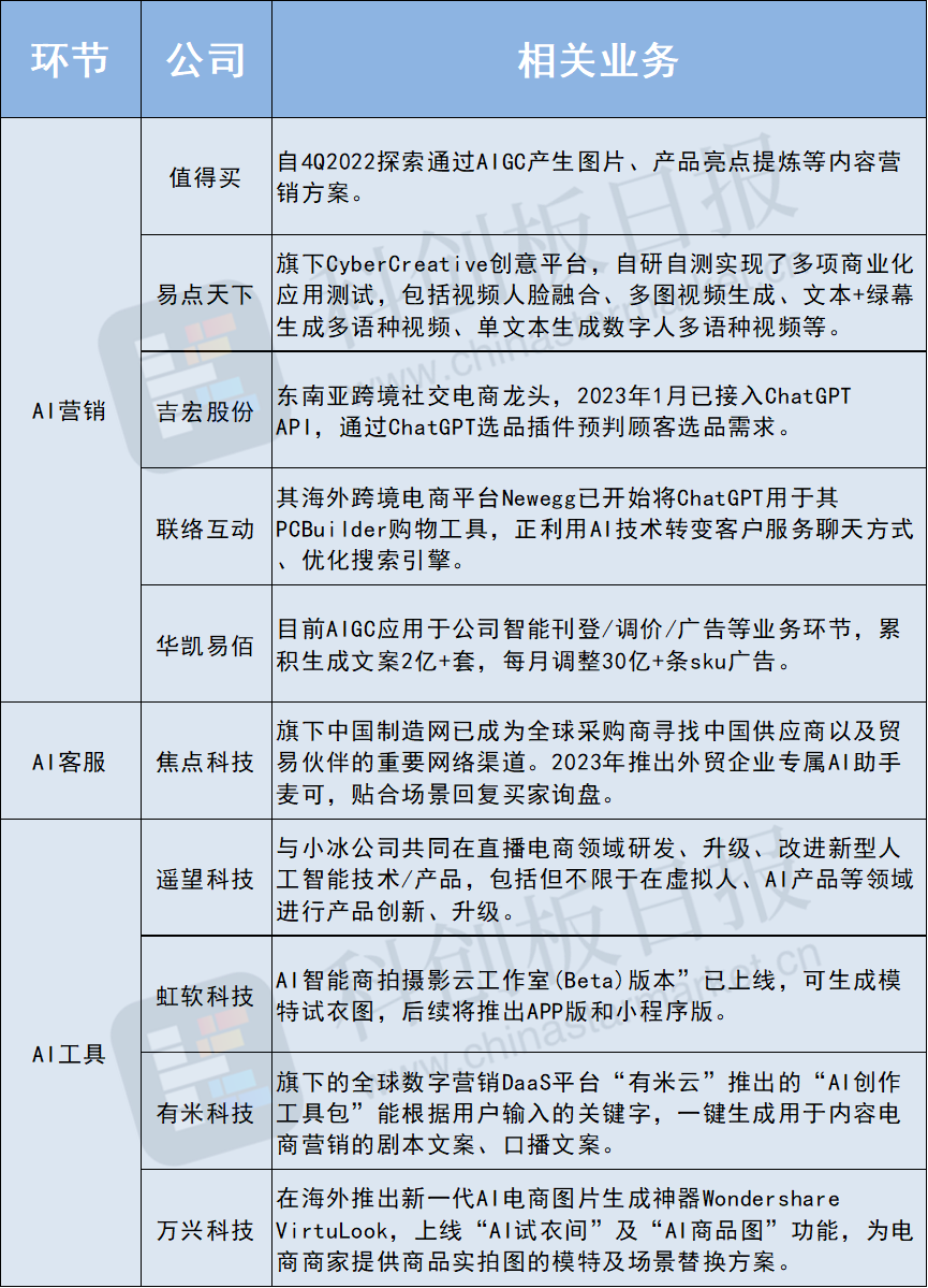 对于吉宏股份、焦点科技、华凯易佰等跨境电商平台,ChatGPT等AIGC工具目前的语言系统、交互效果与海外业务兼容性更强,助力运营效率提升、精细化运营和智能化系统开发;