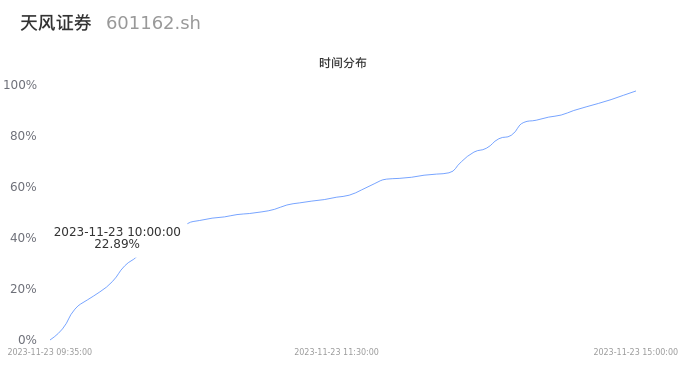 601162天风证券2023年11月23日成交95.27万手,成交金额3.12亿元,相较昨日缩量26.66万手,换手率1.10%,成交清淡。